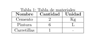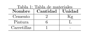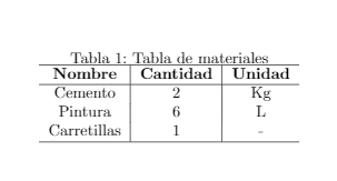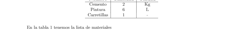 En la tabla \ref{tab:tabla1} tenemos la lista de materiales