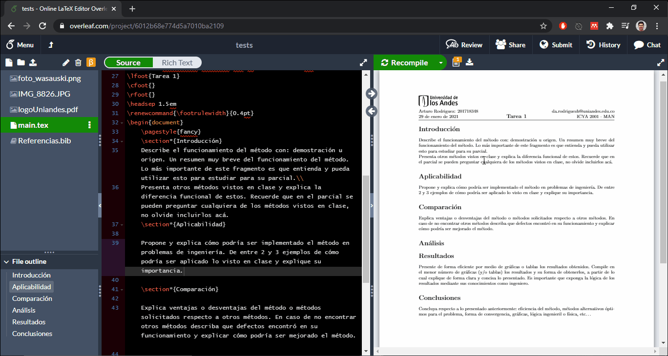 Este archivo lo guardamos en la misma carpeta del documento y lo llamamos Referencias.bib. Posteriormente, actualizamos el preambulo del documento así: